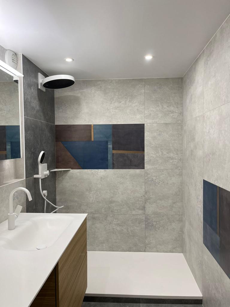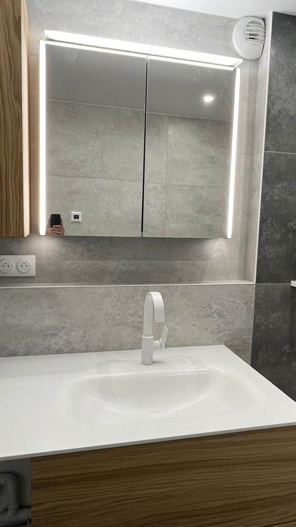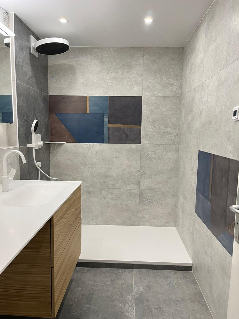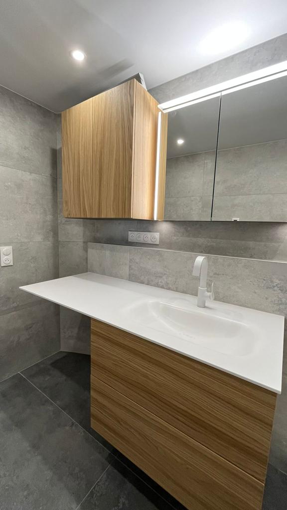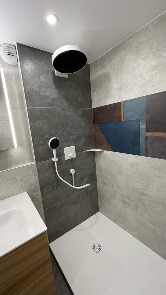 Une fois ces tâches achevées, la rénovation se poursuit avec l’implantation d’une robinetterie encastrée. Nous avons spécifiquement confié cette opération à nos spécialistes dans le domaine. En effet, à Eau Air Gaz, nous faisons tout le nécessaire pour vous offrir un rendu de qualité. Enfin, l’intervention s’est close avec le montage d’un meuble vasque avec 2 grands tiroirs en bois rouvre naturel.